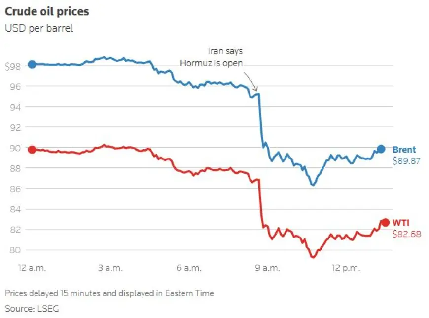 Houston. Oil prices plunged by about 13 percent on Friday April 17, 2026 after Iran's foreign minister said passage for all commercial vessels through the Strait of Hormuz was open for the remaining ceasefire period and US President Donald Trump said Iran has agreed to never close the strait again.