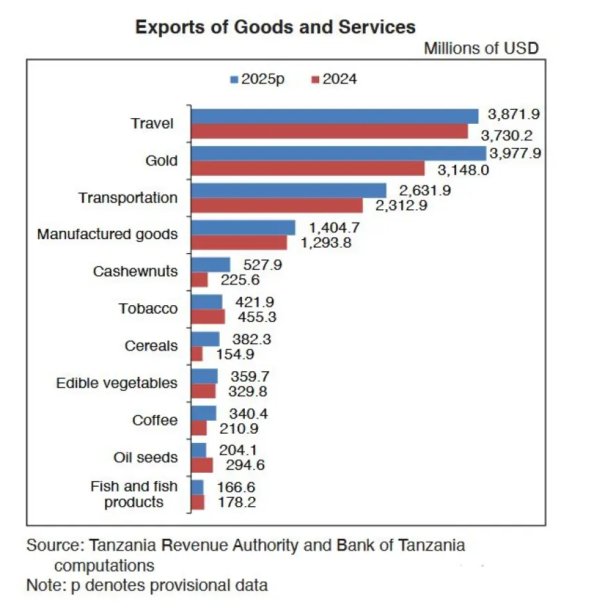 Exports of goods alone rose by 19.7 percent to $9.48 billion, driven by higher earnings from gold, cashew nuts, horticultural products, coffee, and cereals, particularly maize and rice.